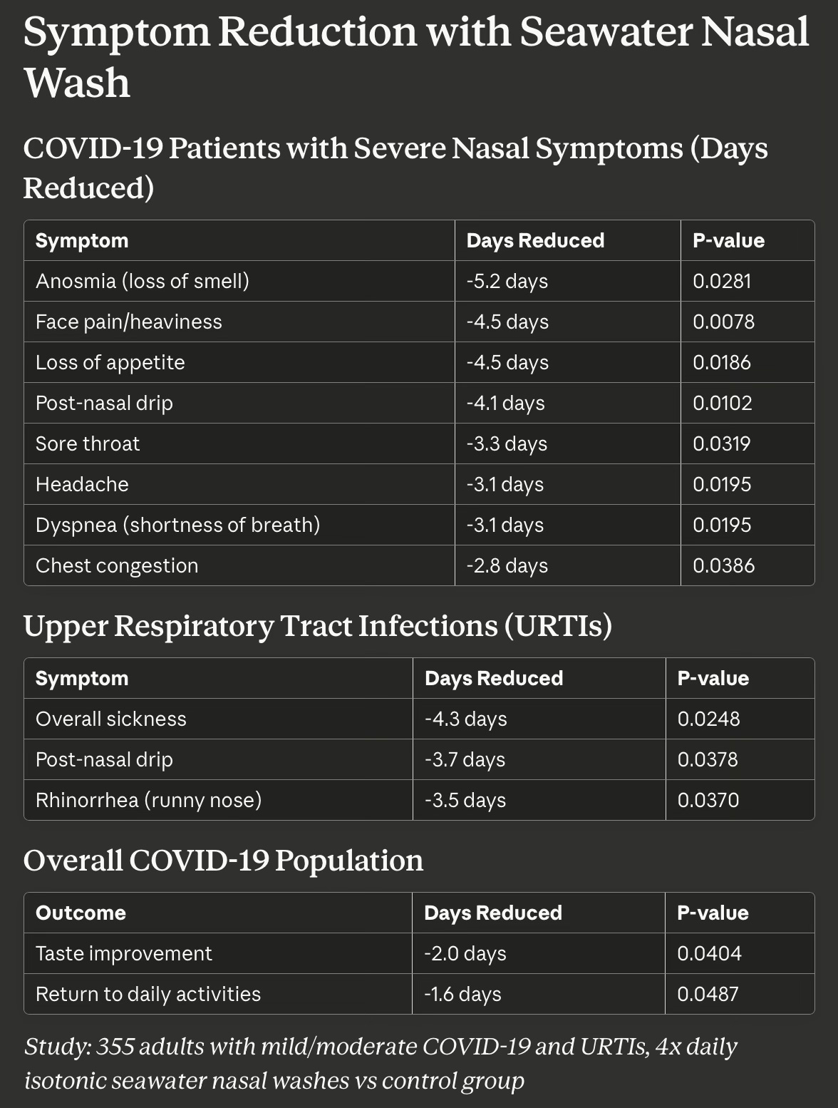 For Covid, multiple studies and systematic reviews have reported that saline nasal irrigation reduces nasopharyngeal viral loads, hastens viral clearance, and provides significant symptom relief, particularly when initiated early in the course of illness.[1][2][3][4][5] For one example, a case-control study found that daily isotonic saline lavages significantly decreased nasal symptoms (blocked nose, runny nose, sneezing) by an average of 25%, with high patient satisfaction and only rare, mild adverse effects.